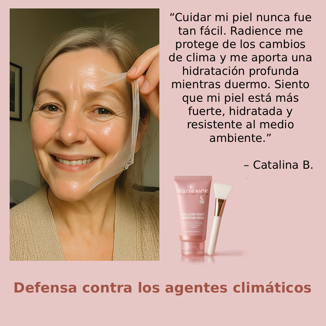 Aplica Radience™ sobre el rostro limpio y déjala actuar entre 15 a 20 minutos. Su fórmula enriquecida con colágeno, antioxidantes e hidratantes naturales penetra en profundidad para nutrir, reafirmar y revitalizar tu piel.